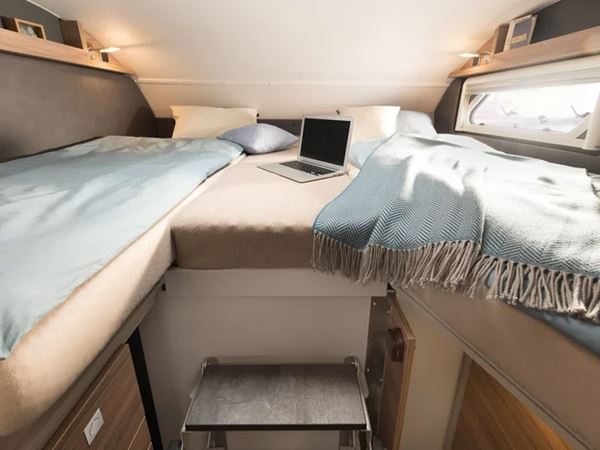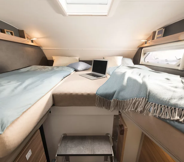 Ongebruikelijk voor een alkoofbed: In de alkoof van de Alpa slaapt men in de lengte in eenpersoonsbedden. Dat betekent echt eenpersoonsbedcomfort. Iedereen kan opstaan zonder over de ander heen te moeten klimmen. De eenpersoonsbedden zijn veilig bereikbaar via een stevige opklapbare trap. Praktisch: de houten schuifdeur sluit de woonkamer af van de bestuurderscabine. • A/I 6820-2