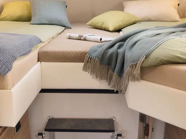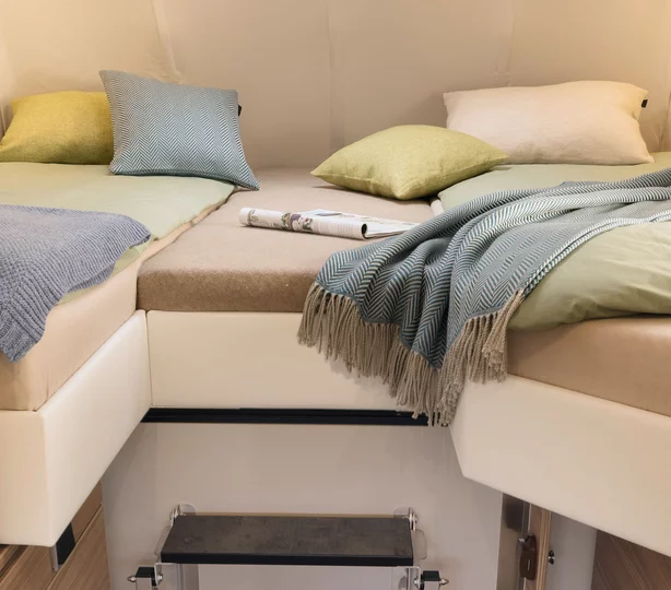 Ook in de integraal modellen slaap je in eenpersoonsbedden. In dit geval in de vorm van een elektrisch verstelbaar "hefbed met eenpersoonsbedden", dat zo ver kan worden neergelaten dat de instap echt eenvoudig en comfortabel is. Belangrijk: Het hefbed met de eenpersoonsbedden wordt als geheel omhoog en omlaag bewogen! Er hoeven geen kussendelen, verlengmodules of dergelijke te worden ingezet! • A/I 7820-2