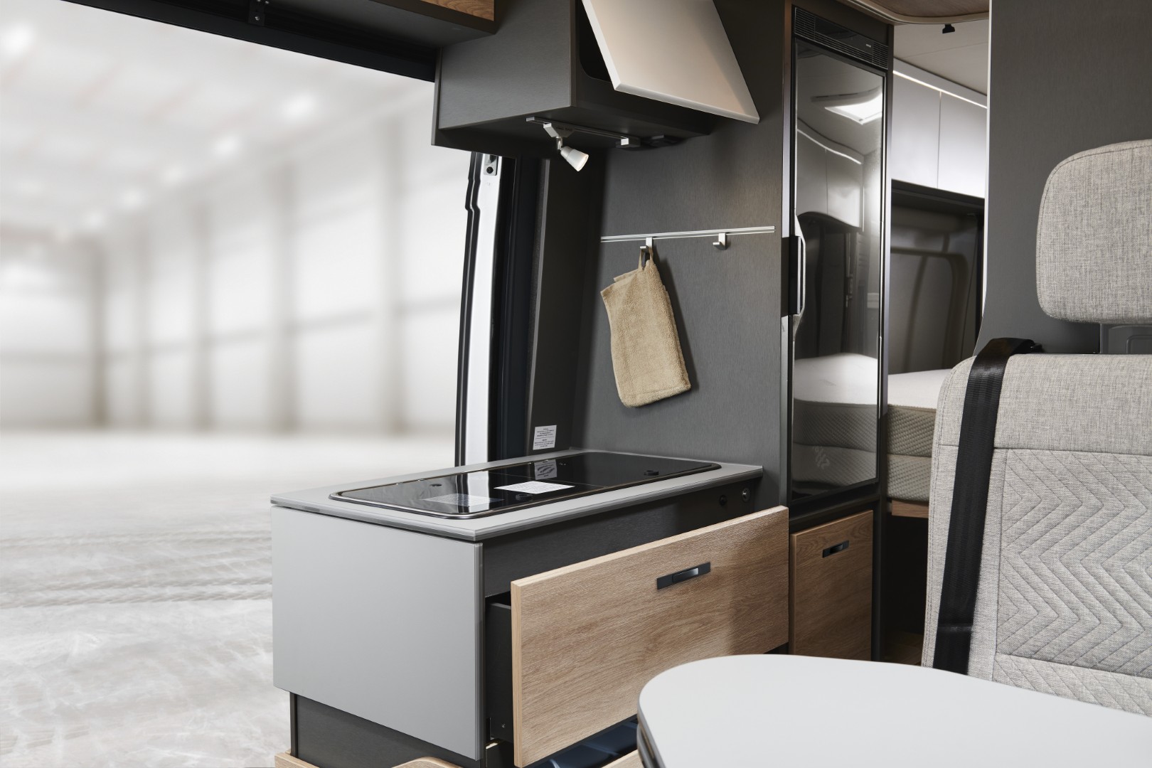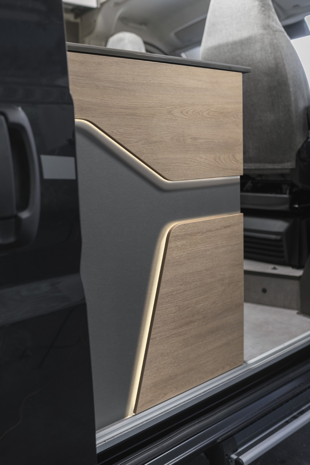 Het dwars ingebouwde tweepersoonsbed maakt een compacte voertuiglengte mogelijk. Voor het vervoer van grote voorwerpen kan het gedeeltelijk worden opgeklapt. Een aangename sfeer in de avond wordt gecreëerd door de indirecte verlichting (optie) boven de bovenkasten.