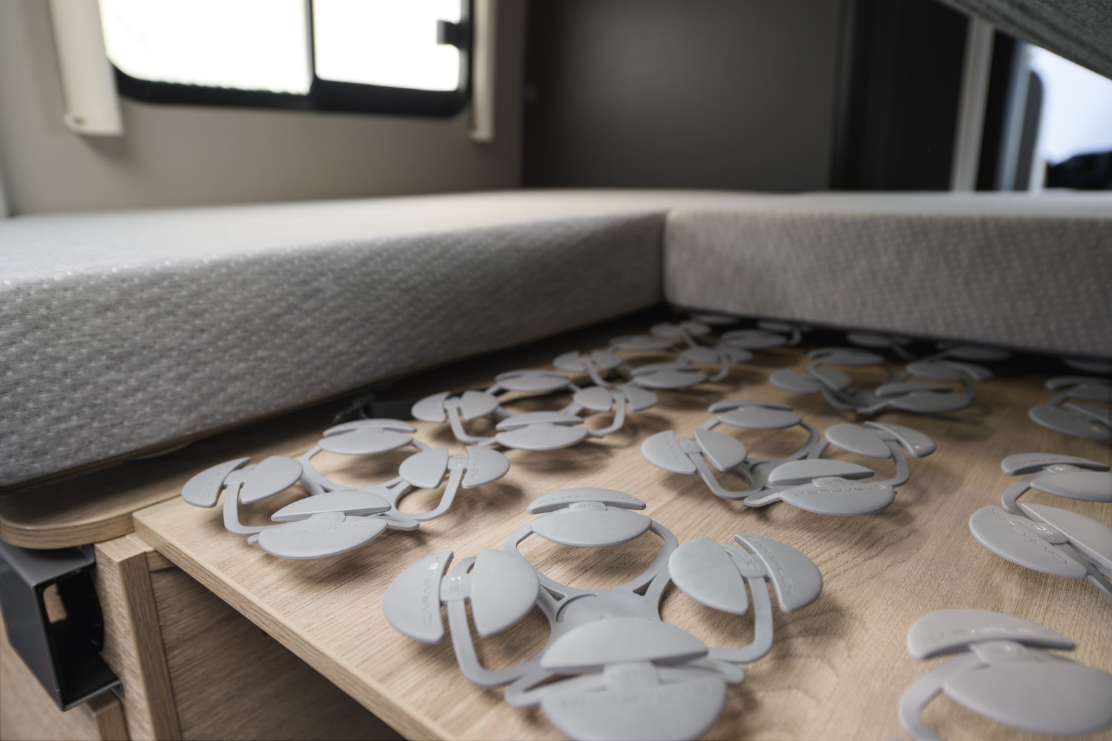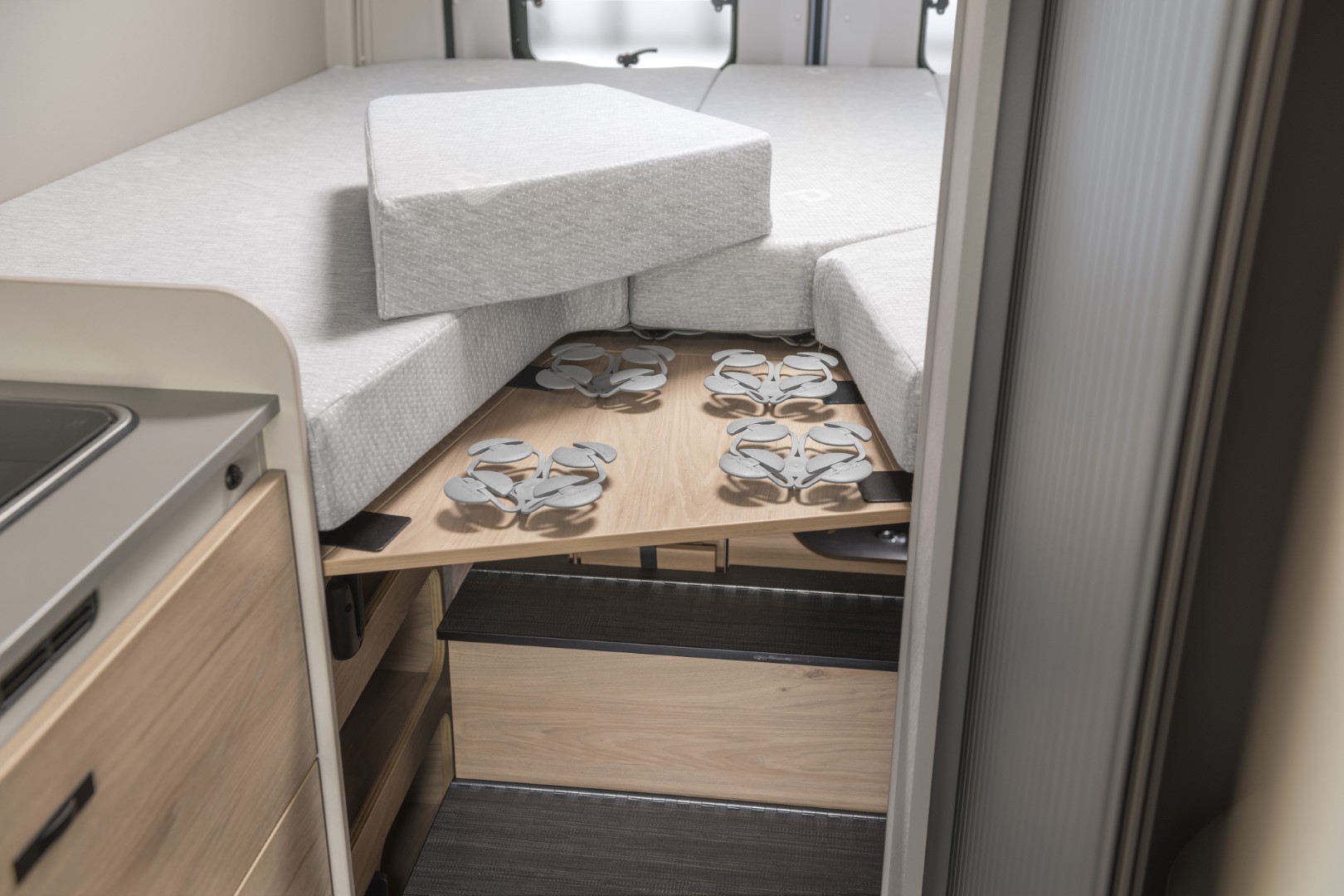 Hefbed voor maximale flexibiliteit in de opbergruimte achterin. Een extra bed onder het hefbed biedt indien gewenst twee extra slaapplaatsen
