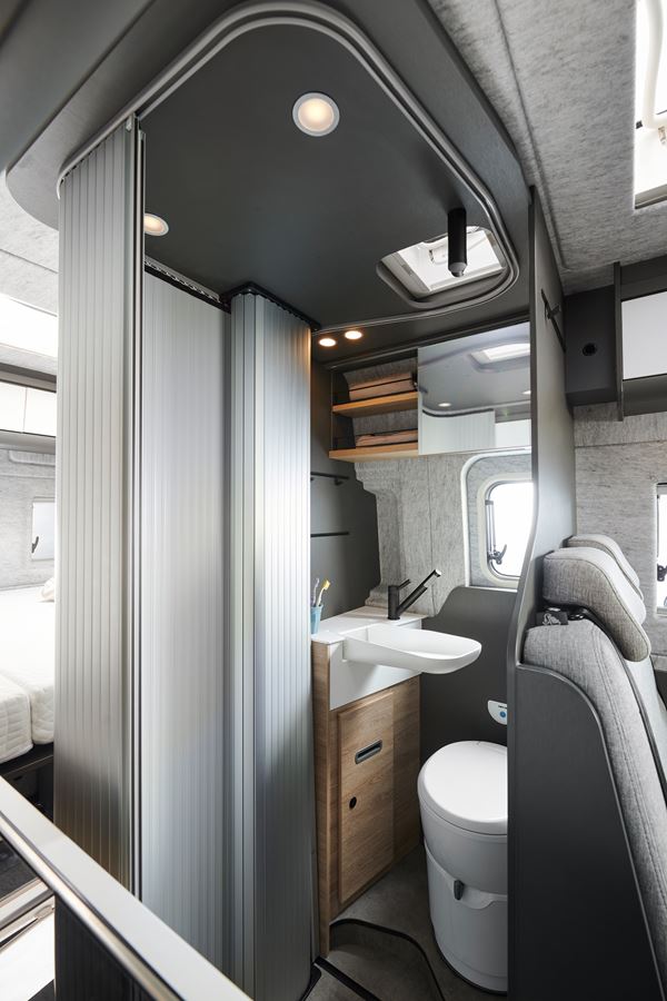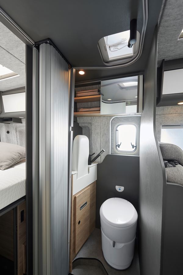 De unieke, ruime badkamer biedt voldoende ruimte en privacy. Een roldeur scheidt de badkamer van het woon- en slaapgedeelte, zonder hinderende opstap daartussen.