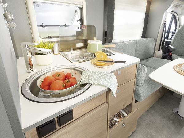 Flexibel multiflex railsysteem met haken. Extra ophangelementen zijn verkrijgbaar als origineel Dethleffs accessoire. Energiezuinige LED spots baden de keuken in helder licht.
