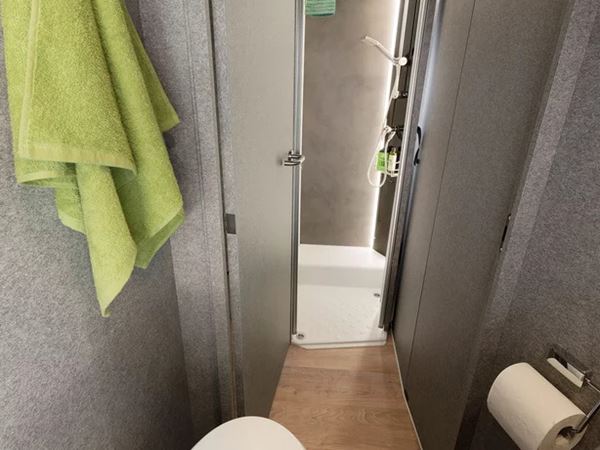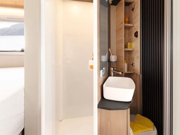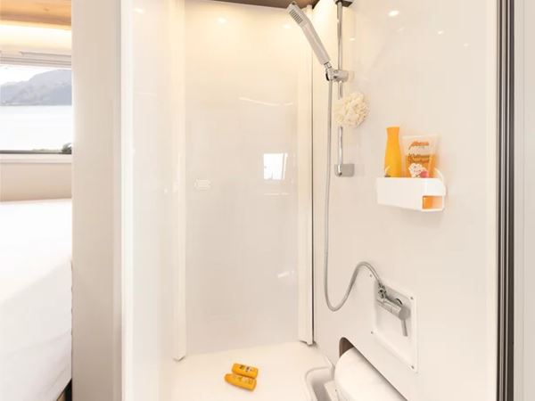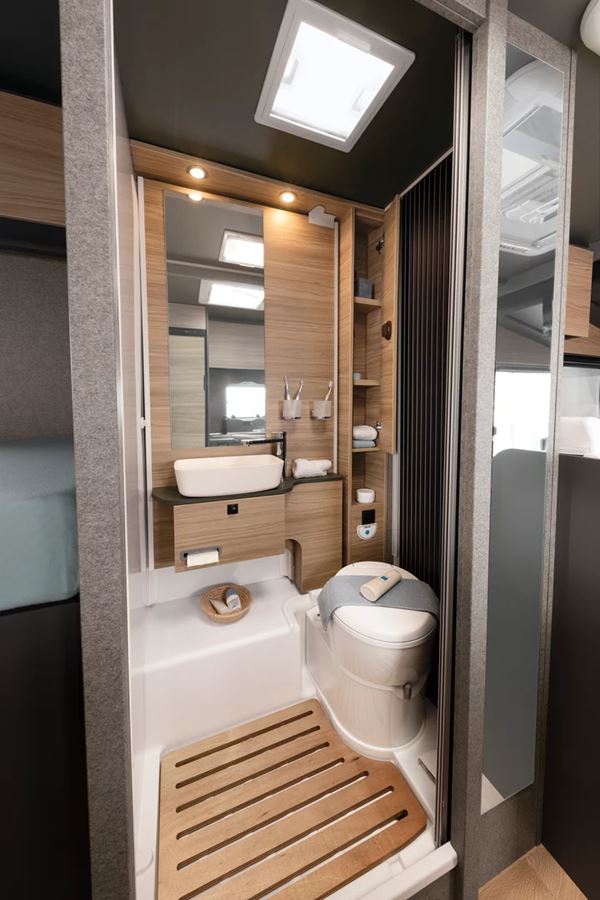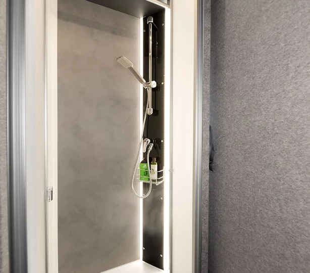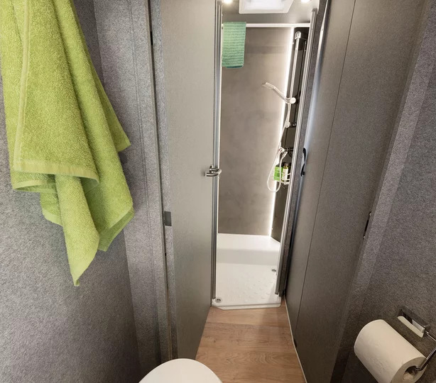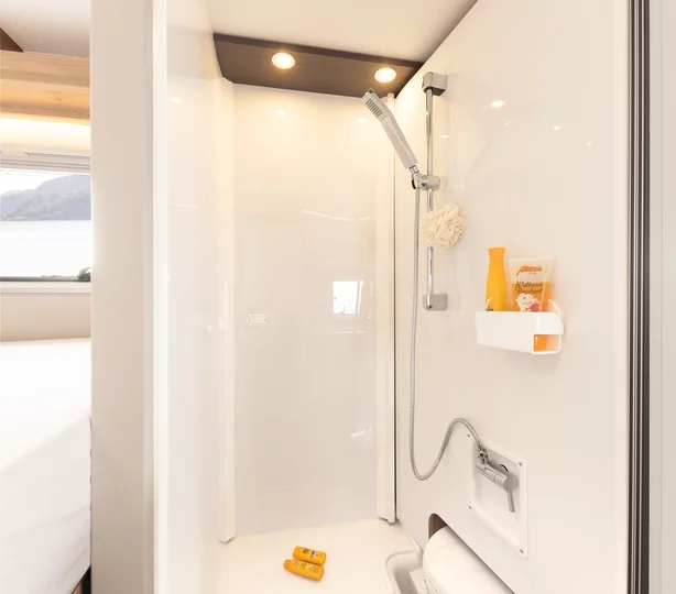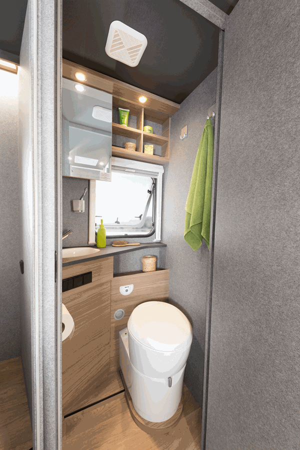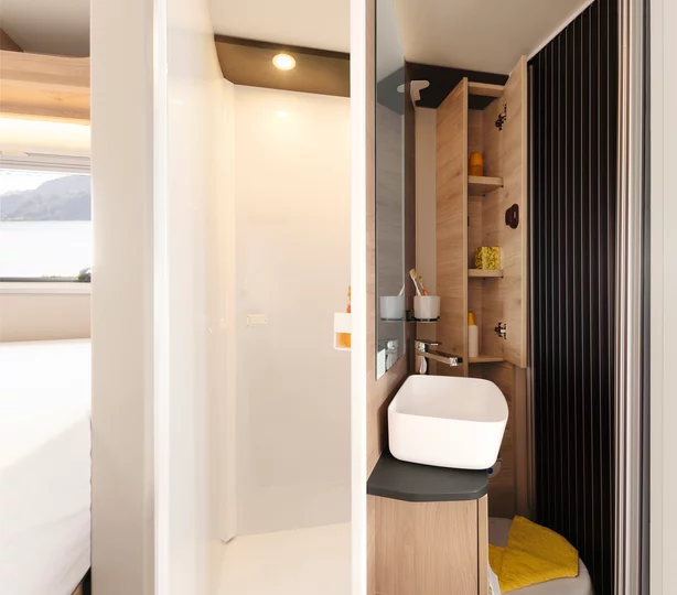 De spiegelkast met schuifdeur biedt veel opbergruimte. Elastische spanrubbers beschermen de lading tegen uitvallen. In veel modellen is op verzoek een raam mogelijk, wat de condensvorming, vooral na het douchen, verbetert.