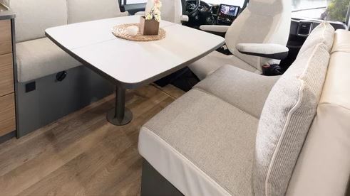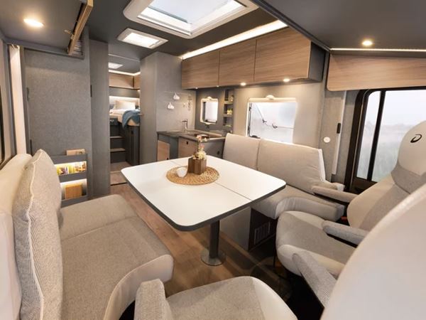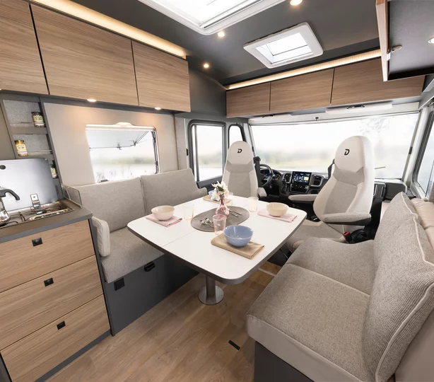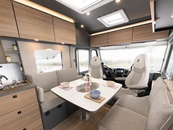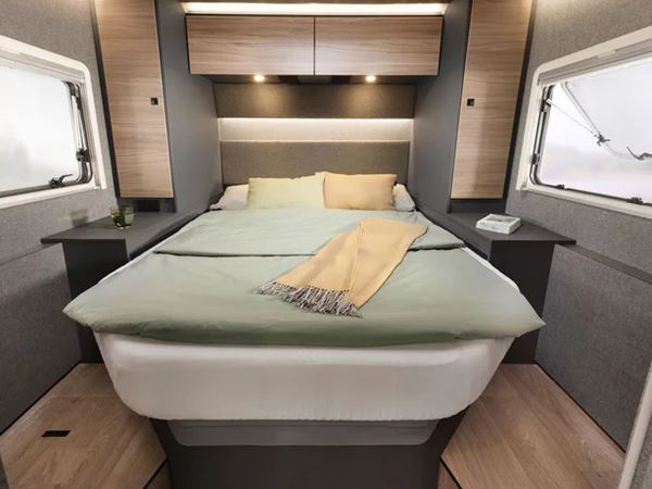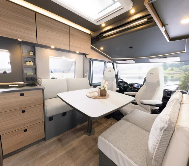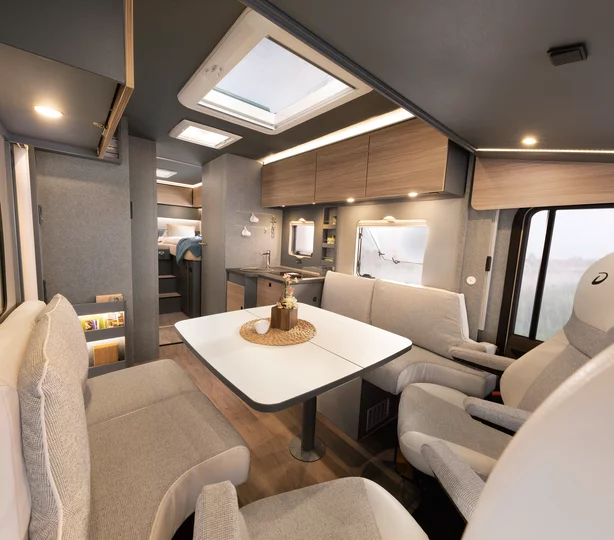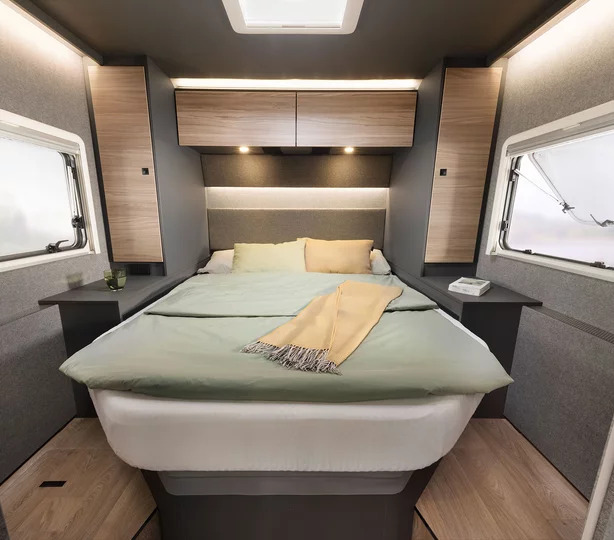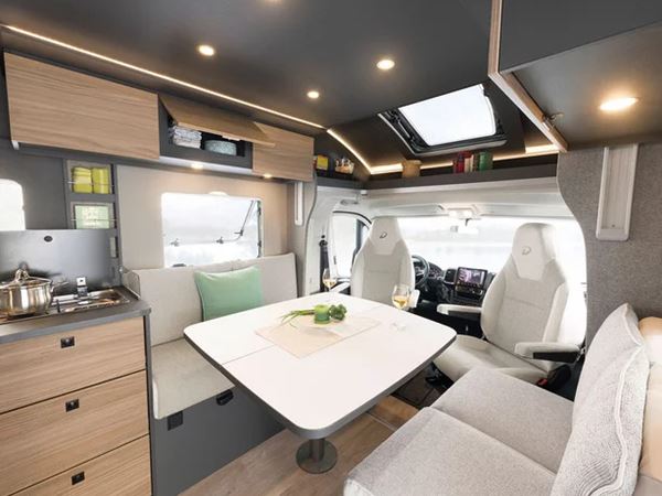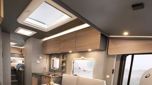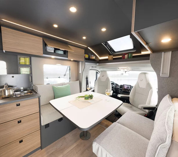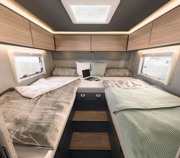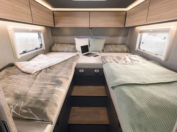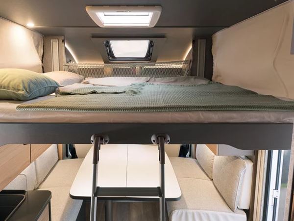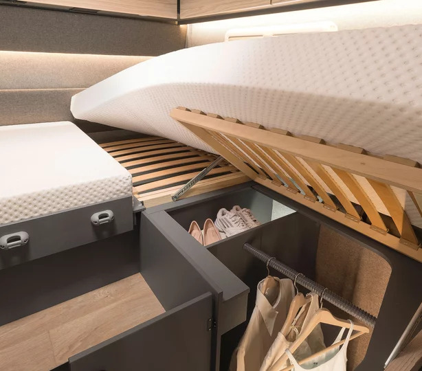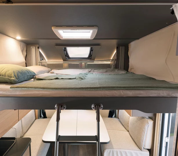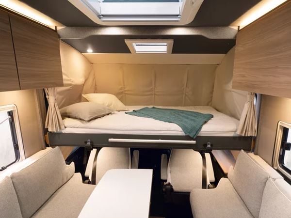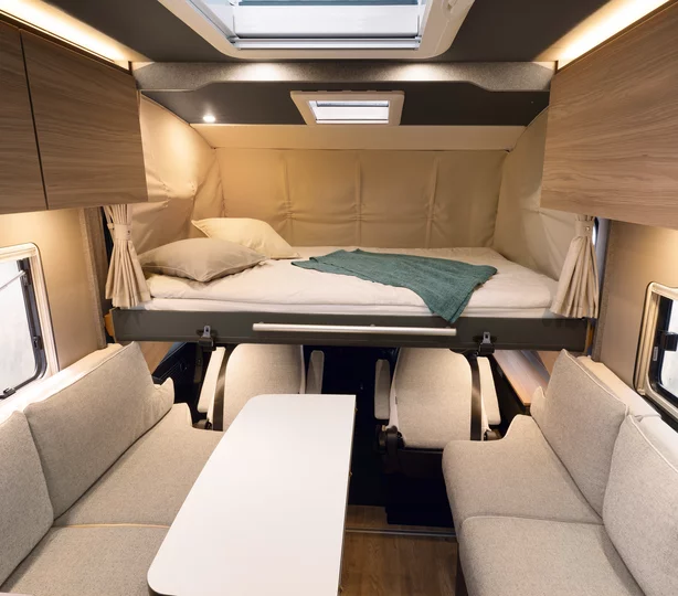 Extra slaapplaatsen nodig? De half integraalmodellen kunnen worden uitgerust met een elektrisch verstelbaar hefbed boven de zitgroep - twee extra slaapplaatsen die overdag geen ruimte innemen.