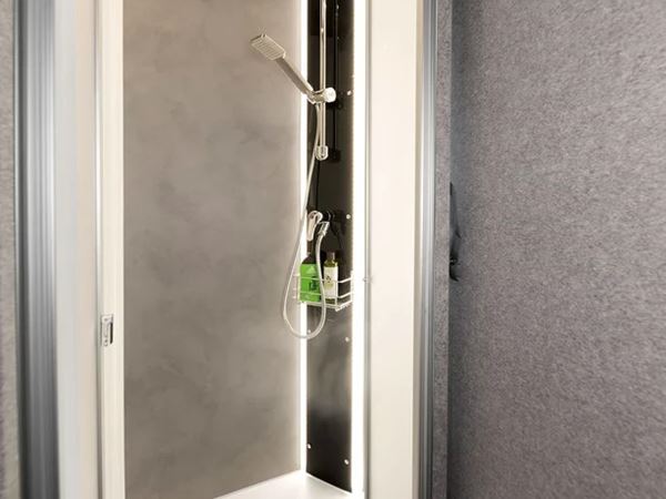 De grote douche is volledig waterdicht bekleed en stijlvol vormgegeven. 's Avonds creëert de verlichte doucheconsole een mooi effect.
