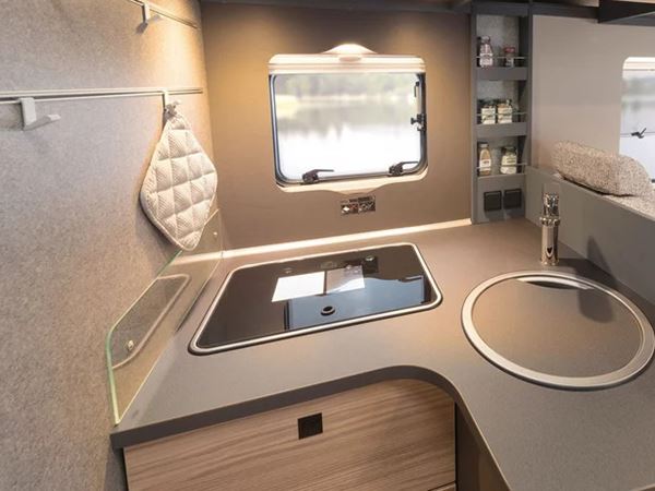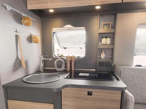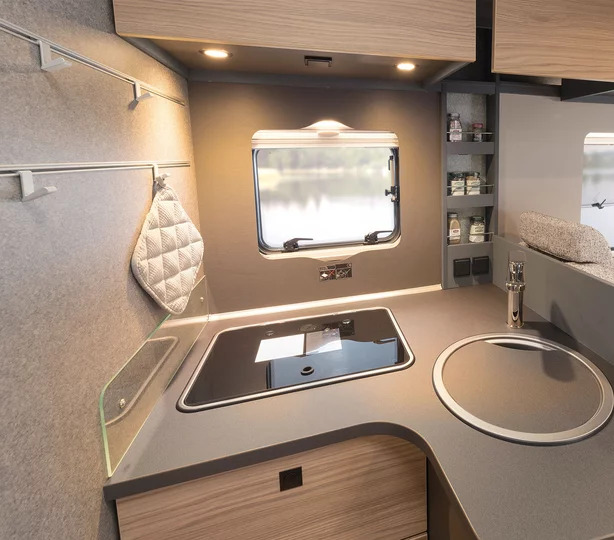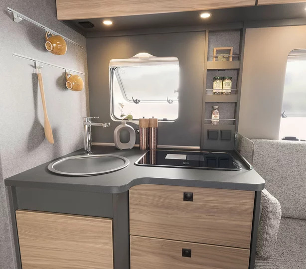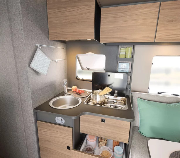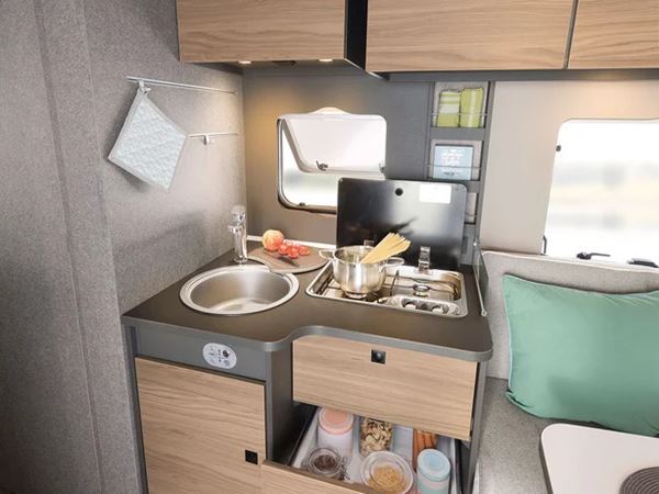 Volledig uitgerust met warmwatervoorziening, een 2-pits gasfornuis en echt veel opbergruimte.