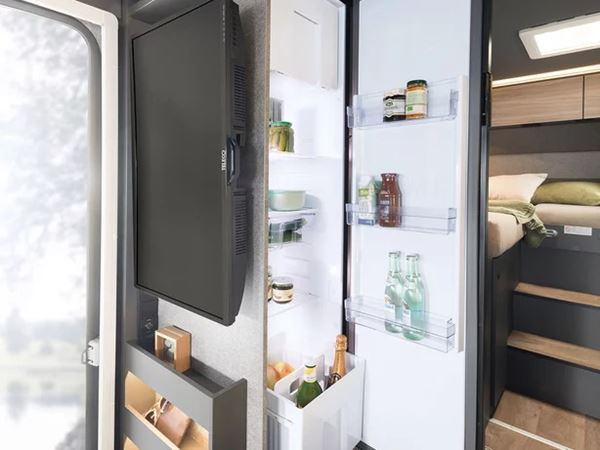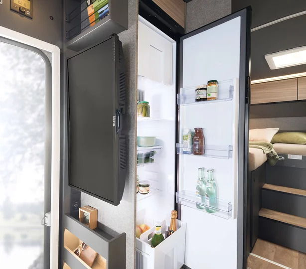 De 137 liter koel-/vriescombinatie is op een handige hoogte geplaatst. Uitgerust met het AES-systeem kiest het automatisch de optimale energiebron (12 V, 230 V of gas)