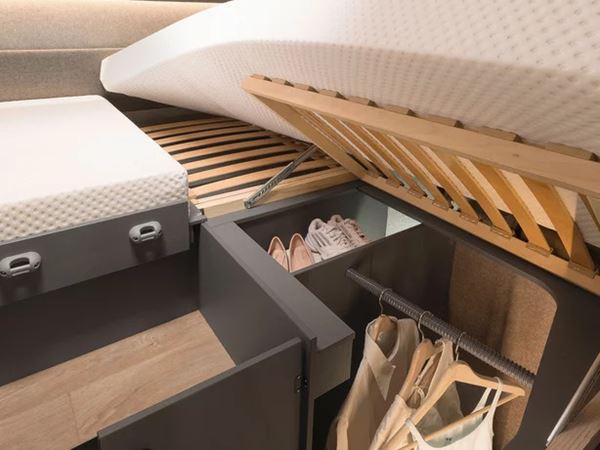 Onder de eenpersoonsbedden bevinden zich echte kledingkasten. De lattenbodem kan in meerdere posities worden vergrendeld en biedt daarmee samen met de kastdeur een comfortabele toegang.