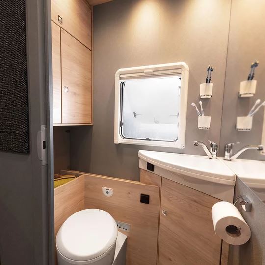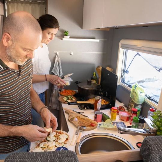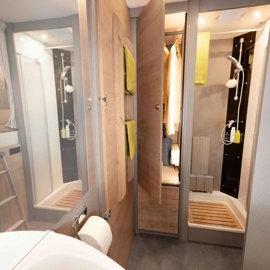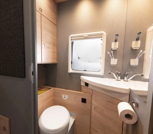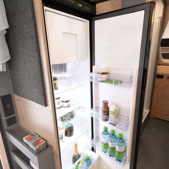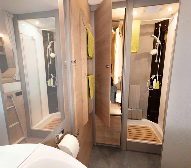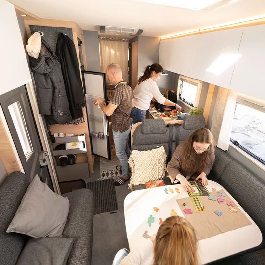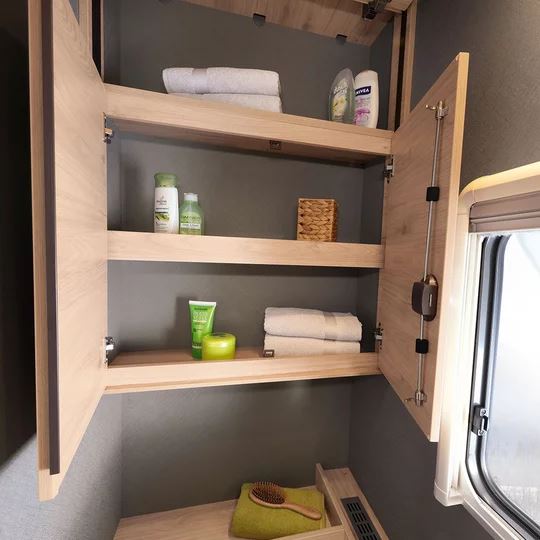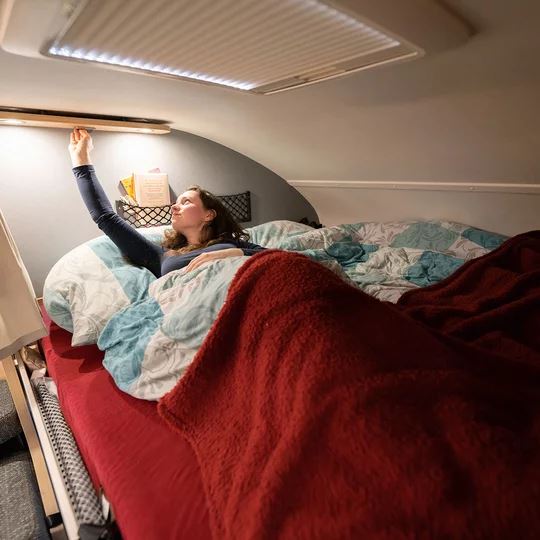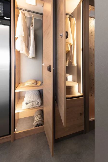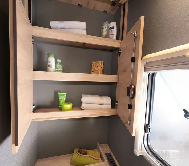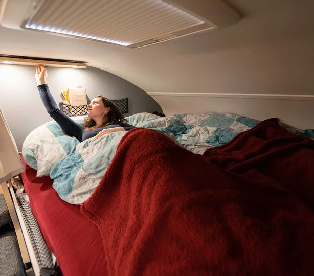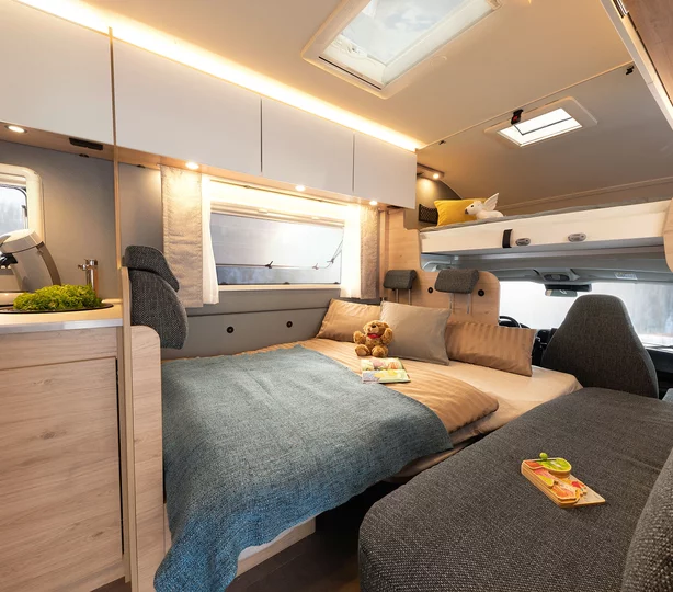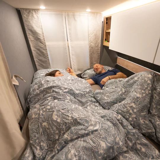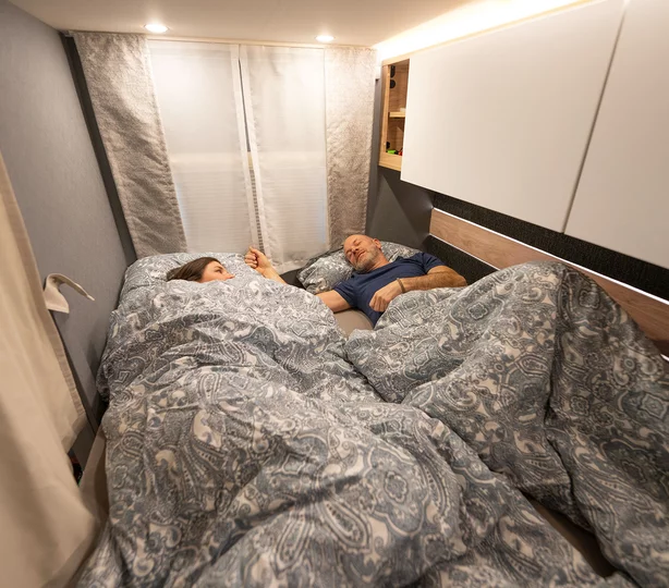 Een slaapkamper zoals jij die wilt: met bedmaten van 211 x 152 cm, twee ramen voor goede ventilatie en grote bovenkasten voor linnengoed. Onder de bovenkasten zijn spannetten aangebracht voor alles wat ’s nachts snel onder handbereik moet zijn. Een 230V-stopcontact en twee USB-stopcontacten zijn beschikbaar voor het opladen van de mobiele telefoon en andere apparaten.