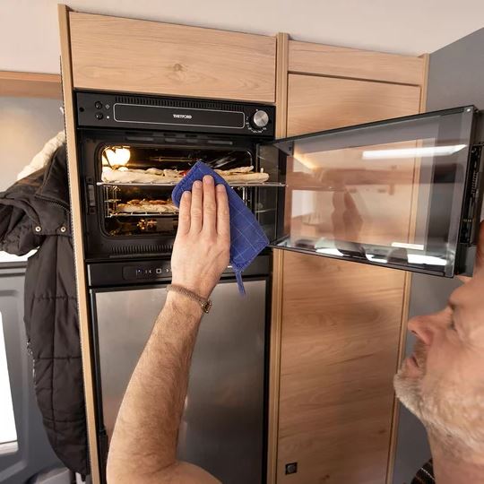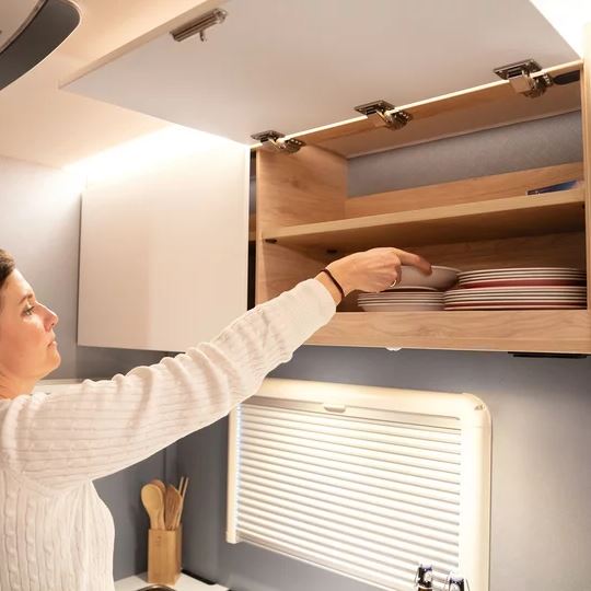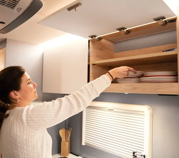 Veel opbergruimte, ook in de bovenkasten. Deze zijn eveneens geventileerd met het Dethleffs AirPlus-systeem en zo beschermd tegen condenswater.
