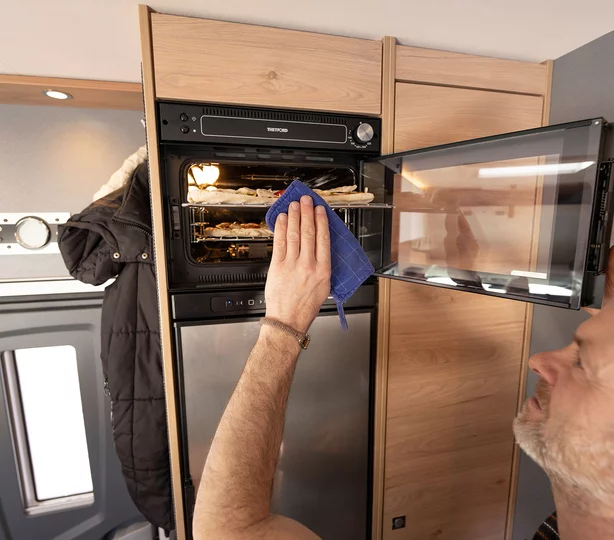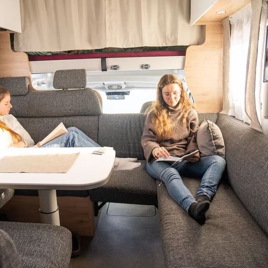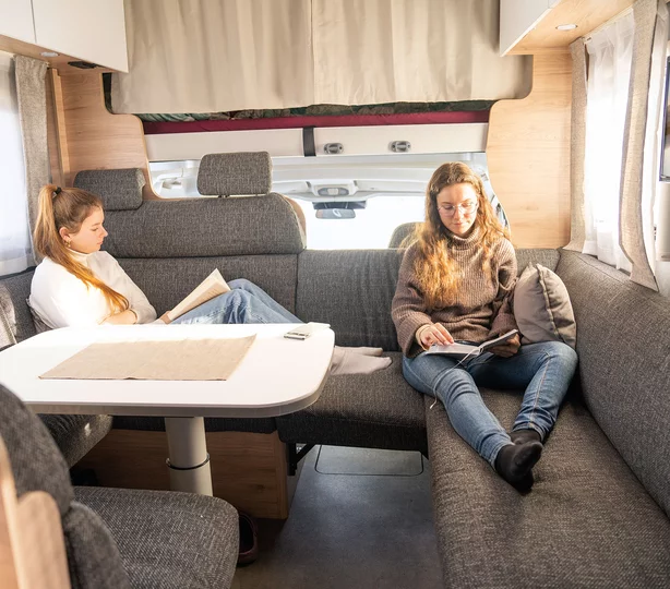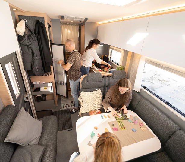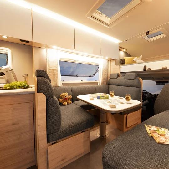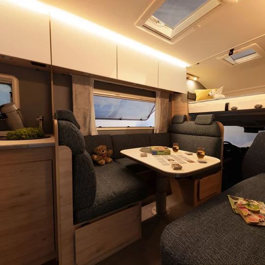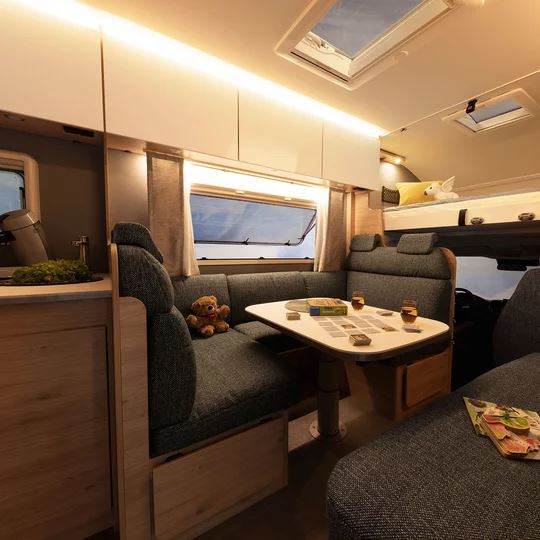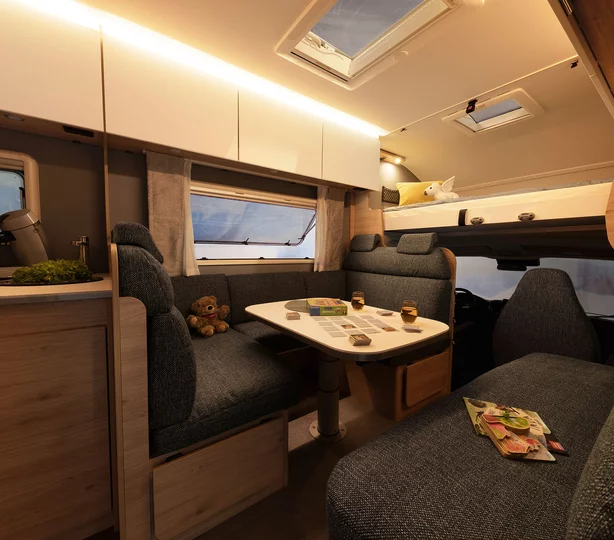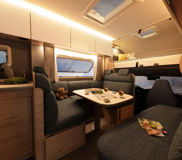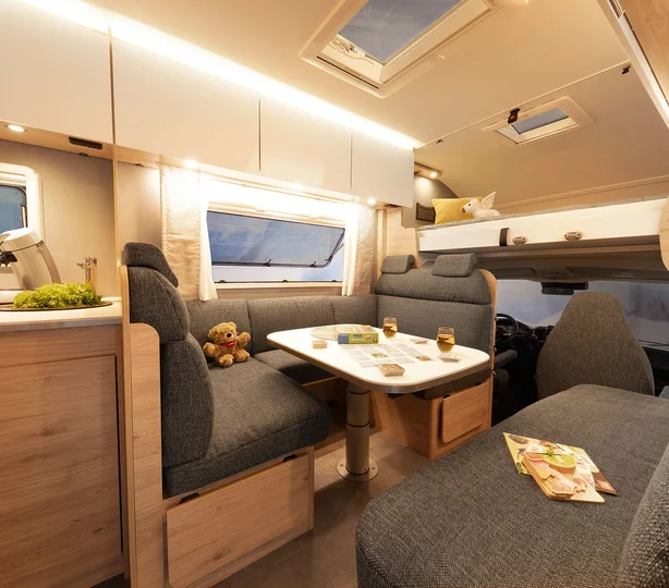 Bijzonder comfortabel: de doorgang naar de cabine kan worden afgesloten met bijpassende bankonderdelen. Dit creëert een royale rondzitgroep en verandert de camper in een gezellige woonkamer, zelfs geschikt voor grote families