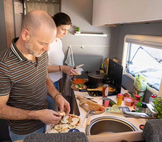 In de ruime alkoof bevinden zich twee slaapplaatsen. Met bedmaten van 210 x 165 cm biedt hij meer dan genoeg plaats en met een zijraam en groot dakluik ook is er ook extra veel toevoer van frisse lucht.