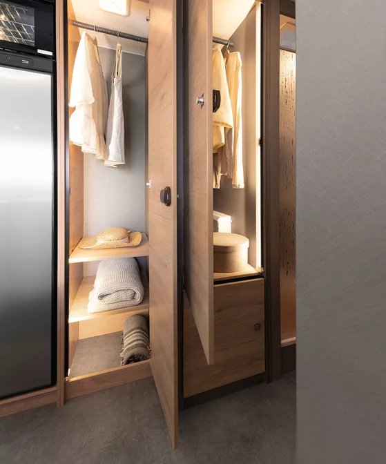 Zeg vaarwel tegen gekreukte kleding! Je jassen, shirts en blouses kun je tijdens het transport netjes ophangen in twee grote kledingkasten met binnenverlichting.