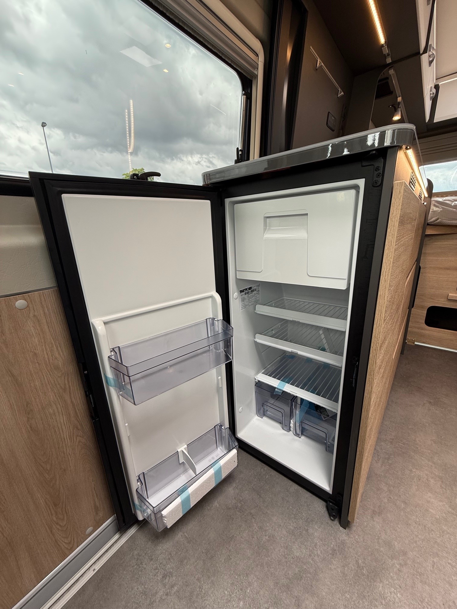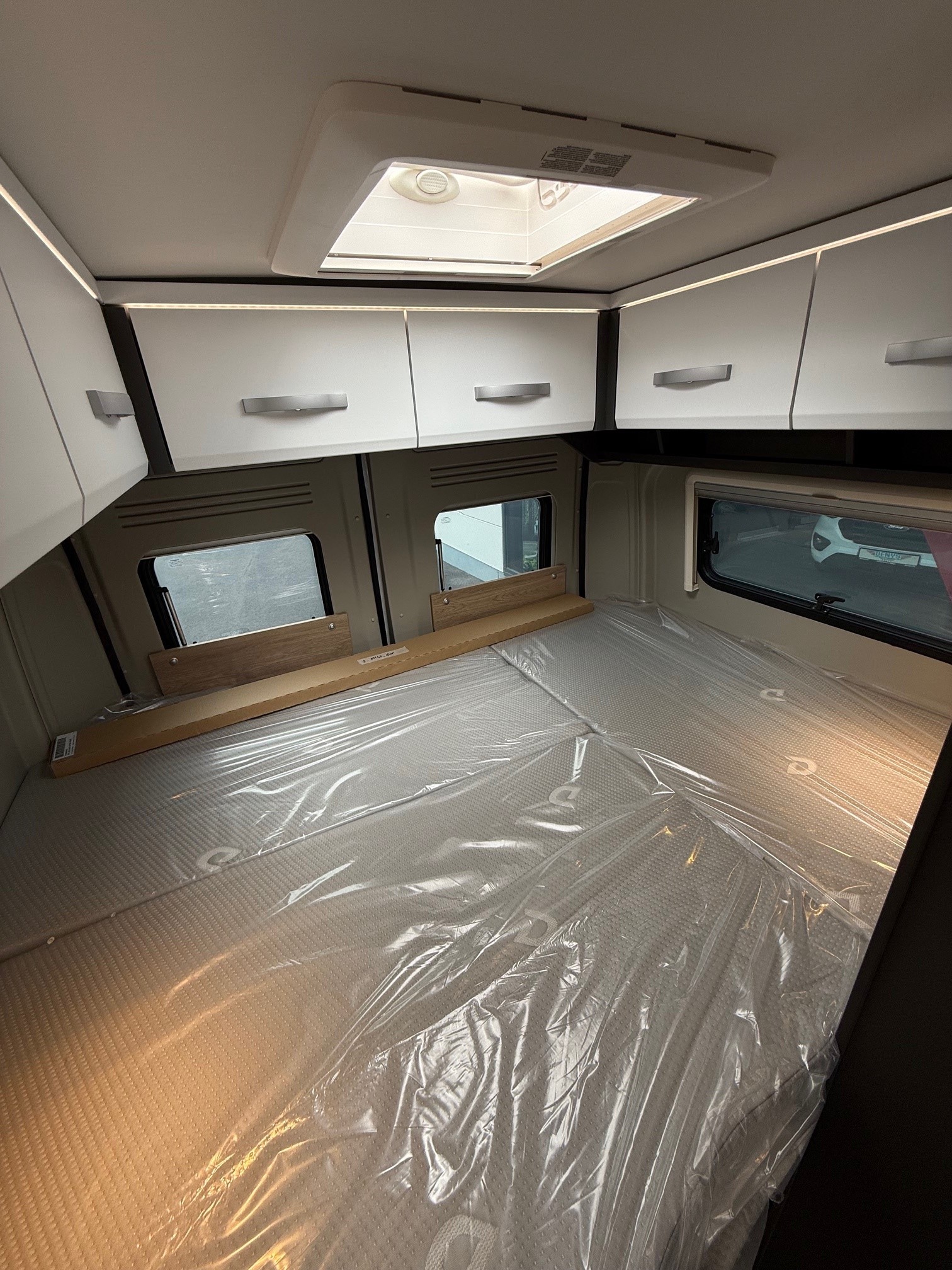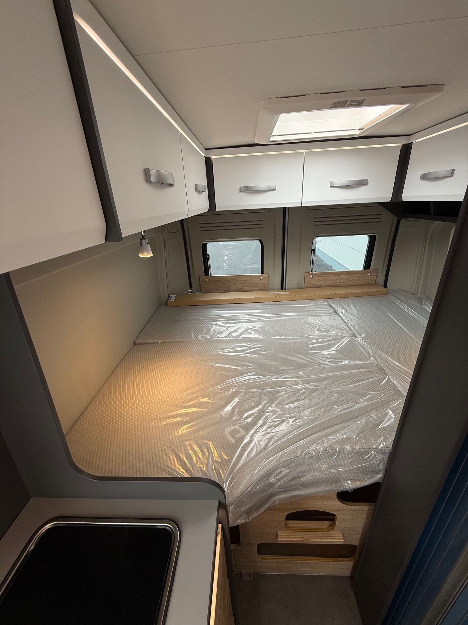 • Comfortpakket: Inlegramen, Raam met combirollo links achter, Luifel 3,75 m, Innovatieve, uittrekbare kast onder het bed, Gefestoneerd tapijt op vloerverhoging, los bijgelegd, Buitenlamp, Draaibare tafelbladverlenging