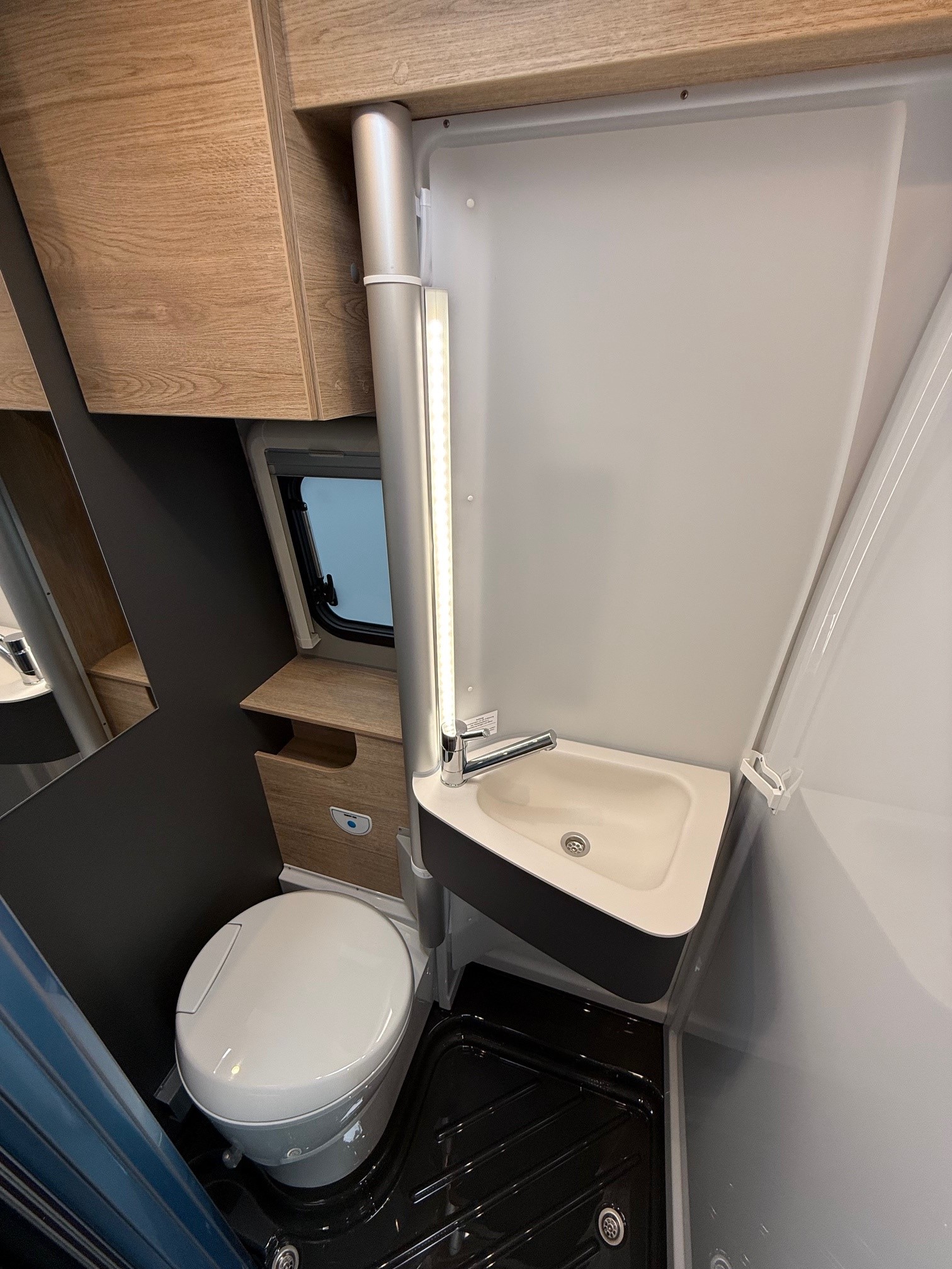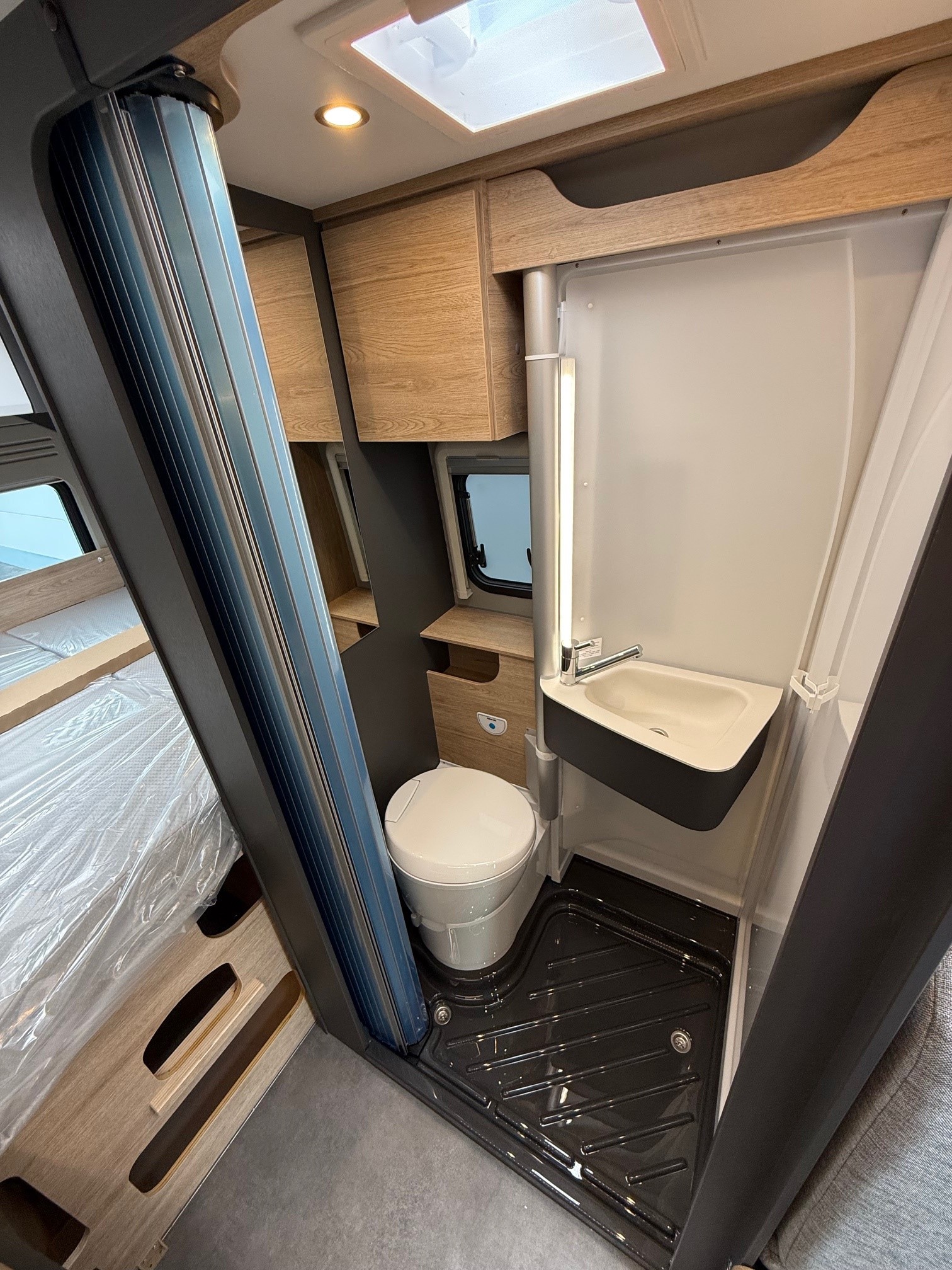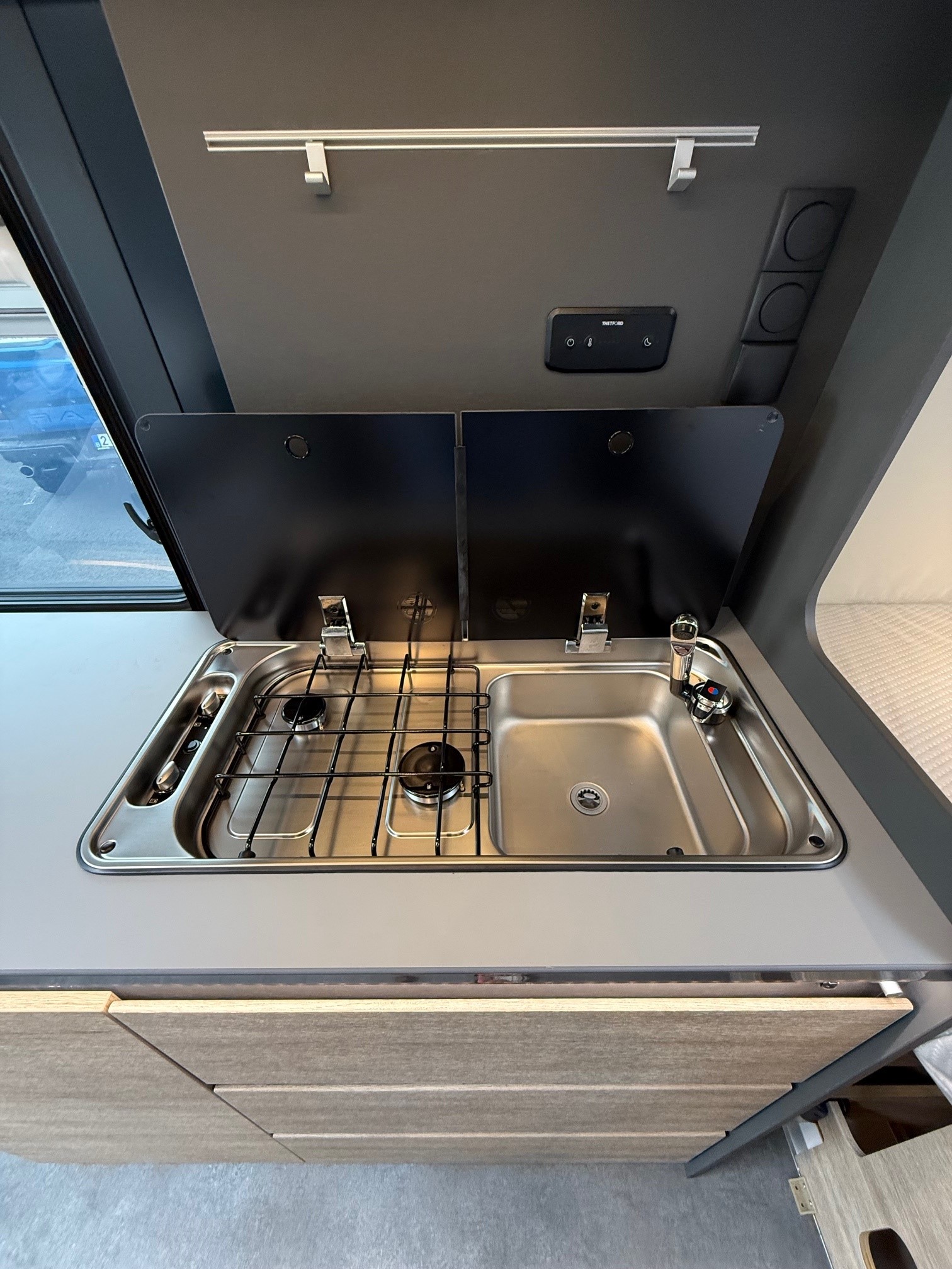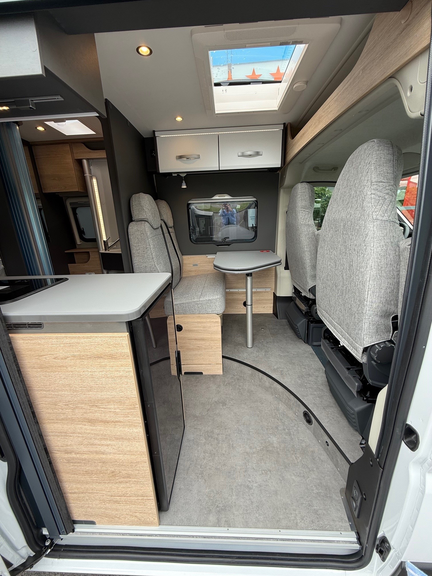 • Comfortpakket: Inlegramen, Raam met combirollo links achter, Luifel 3,75 m, Innovatieve, uittrekbare kast onder het bed, Gefestoneerd tapijt op vloerverhoging, los bijgelegd, Buitenlamp, Draaibare tafelbladverlenging
