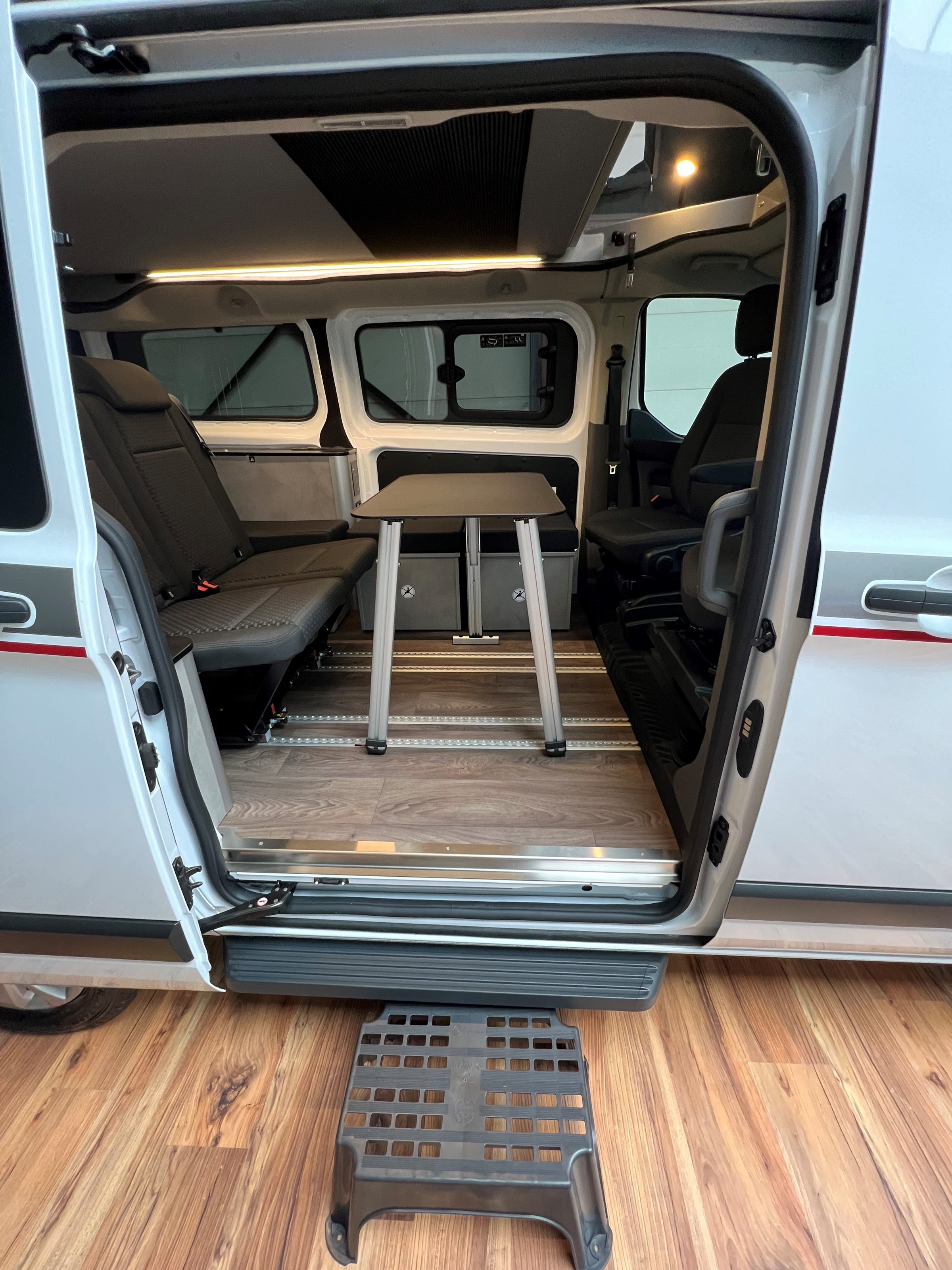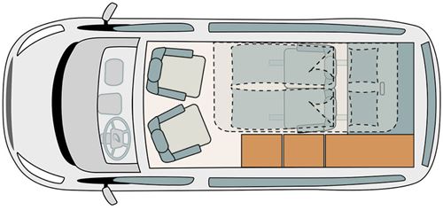 - Stoelpakket 13: bestuurdersstoel 4-voudig instelbaar, met rugondersteuning en tafeltje in dubbele passagiersstoel, stoffen bekleding Ebony