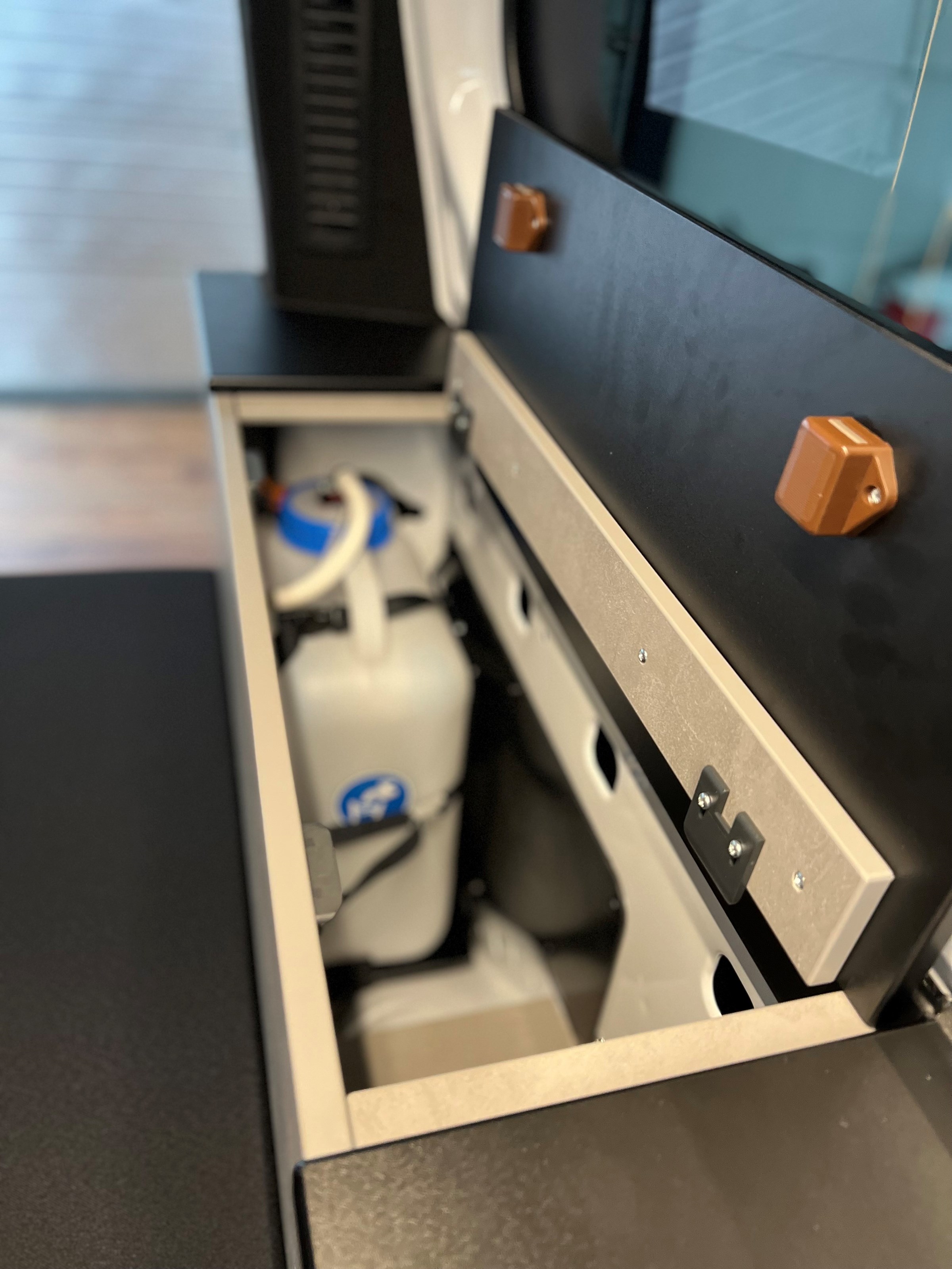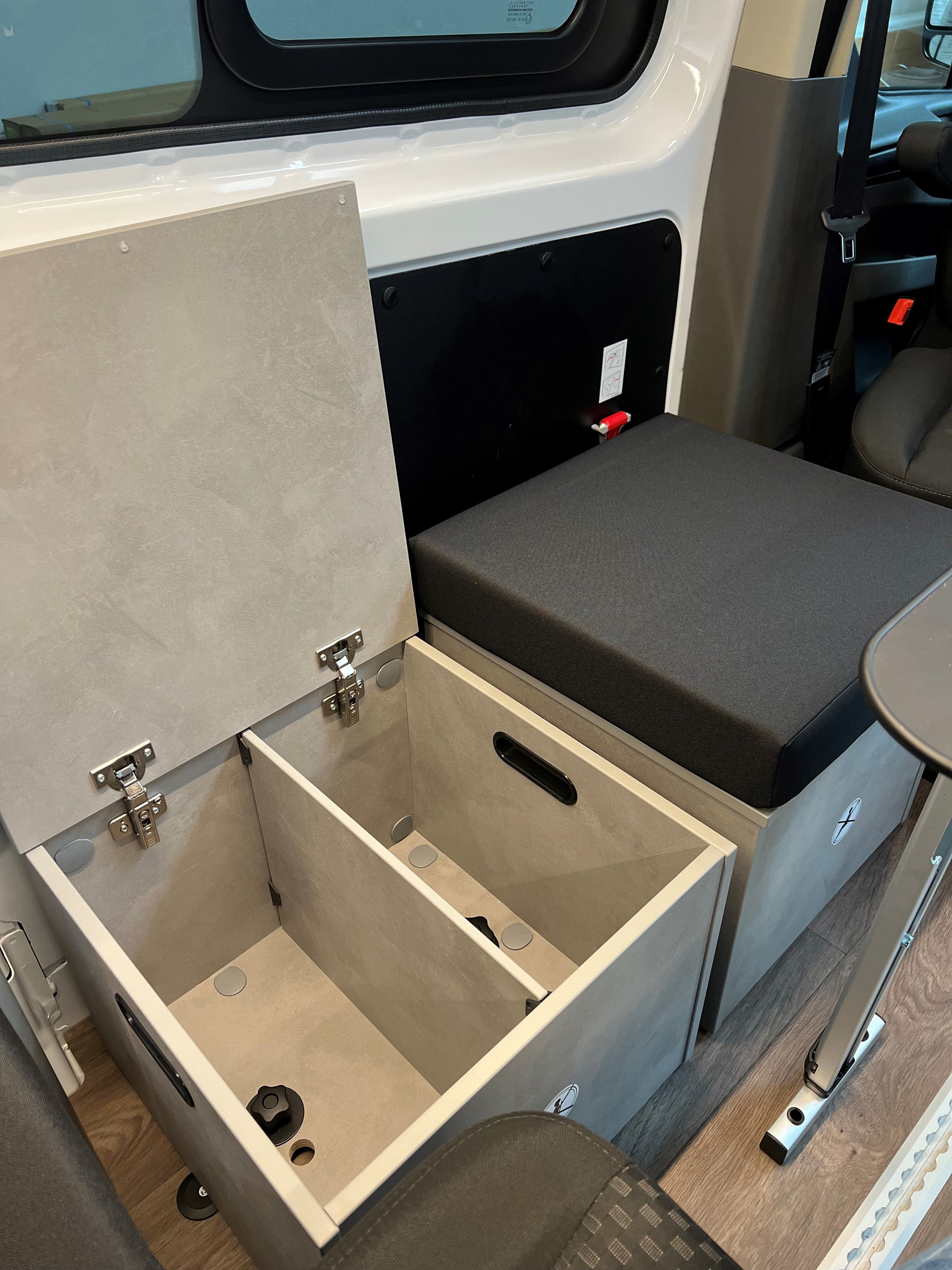 - Comfortabele draaistoelen voor bestuurder en passagier met stoffen bekleding, armleuning en rugondersteuning