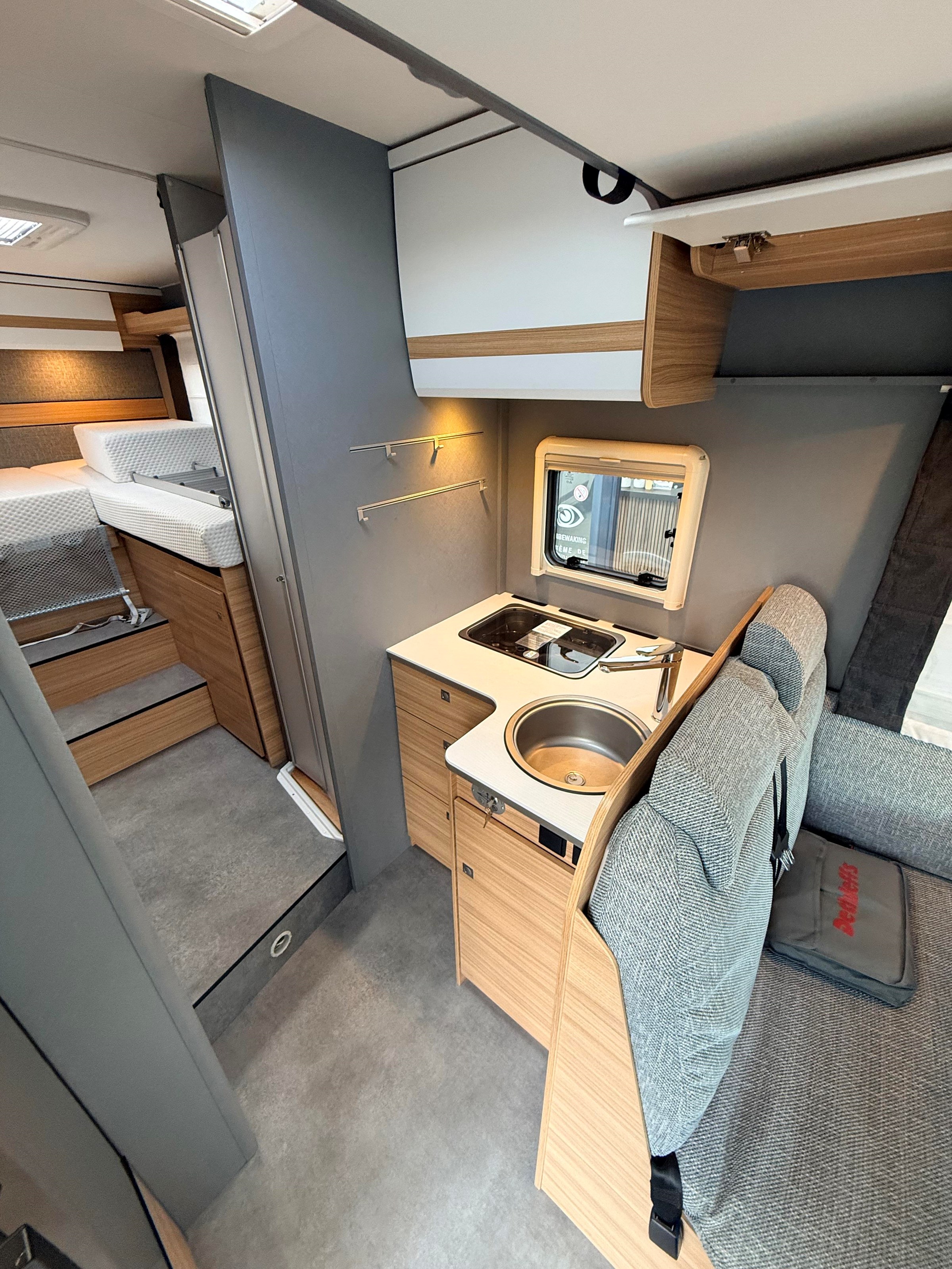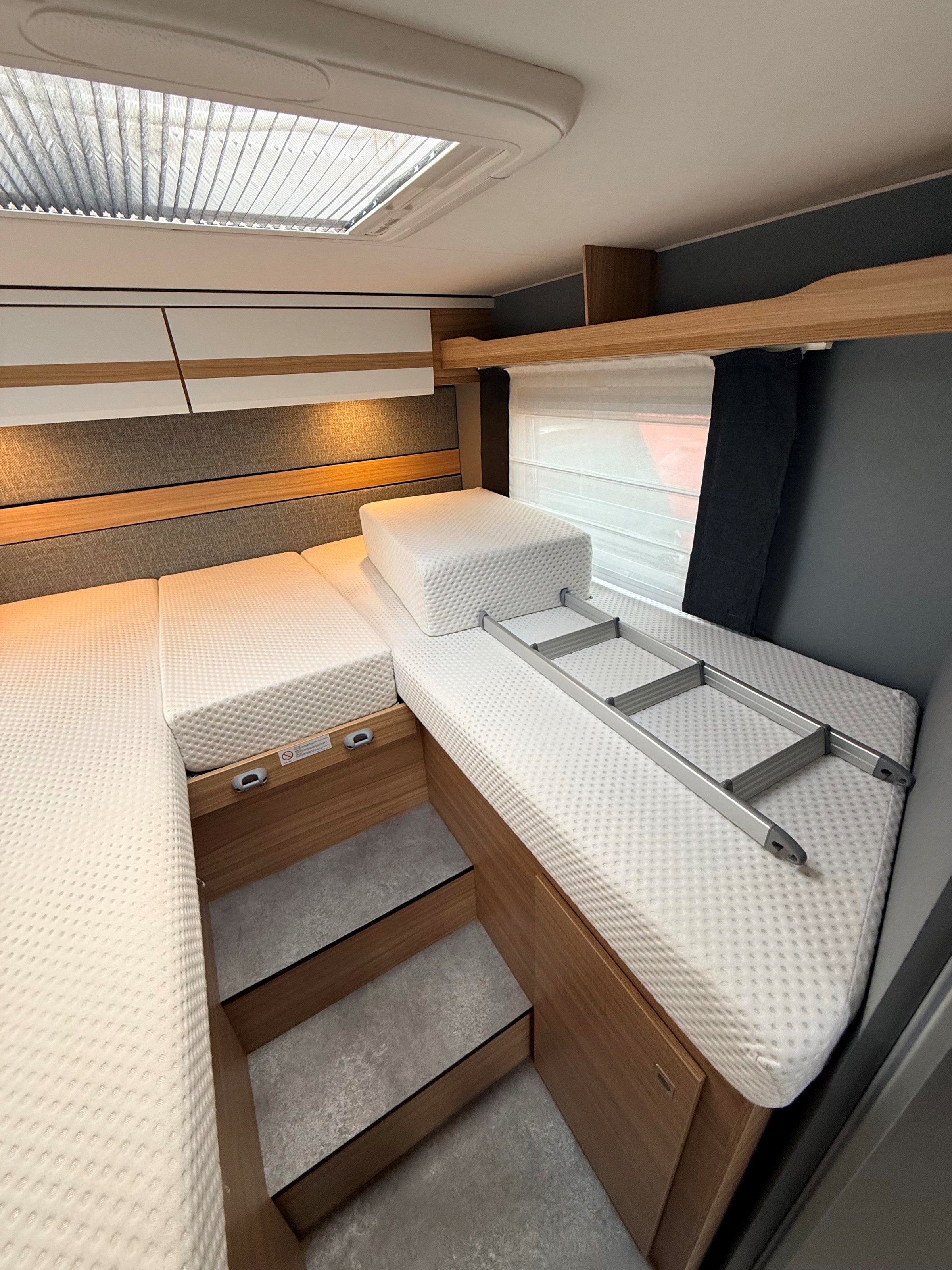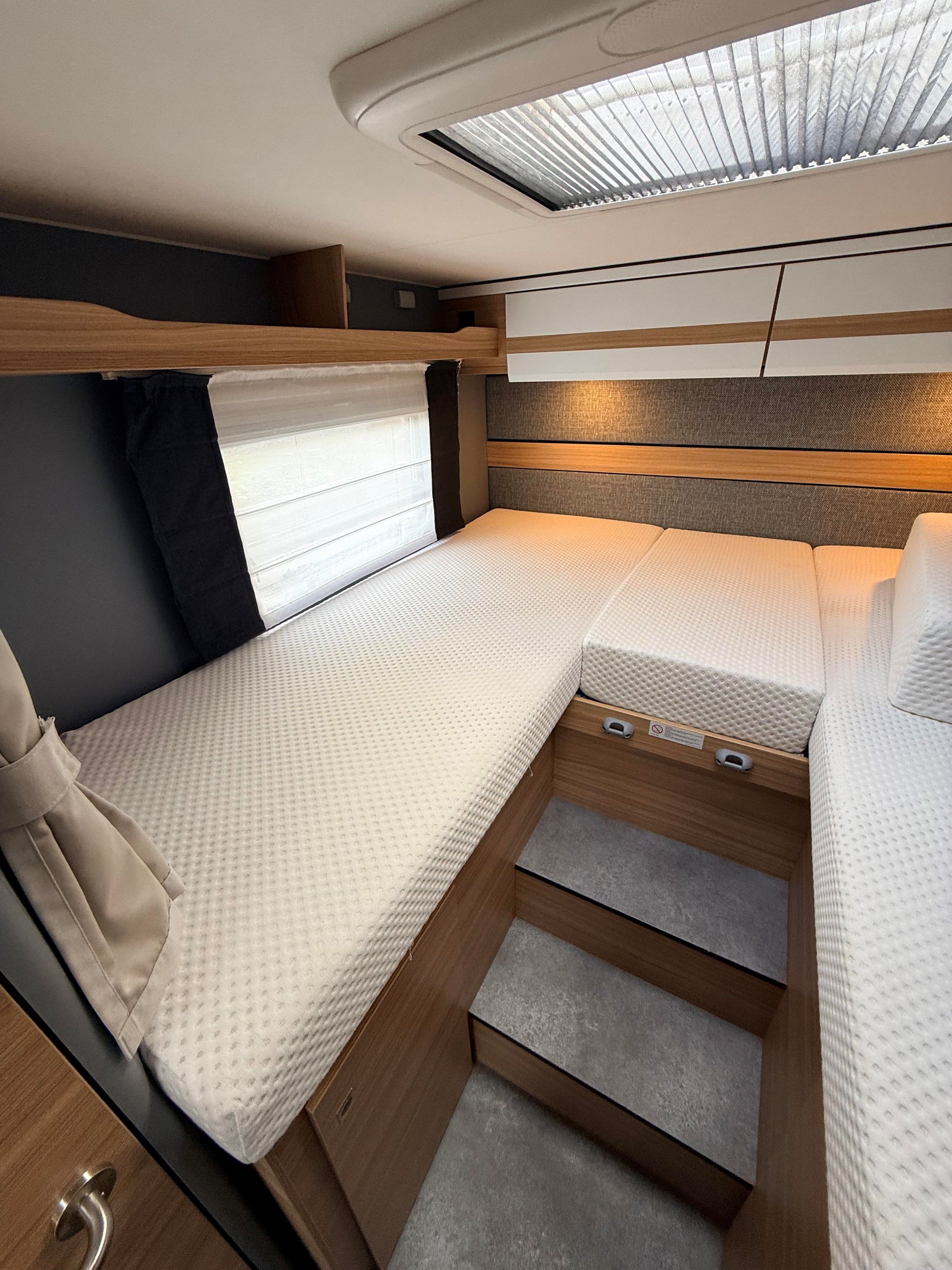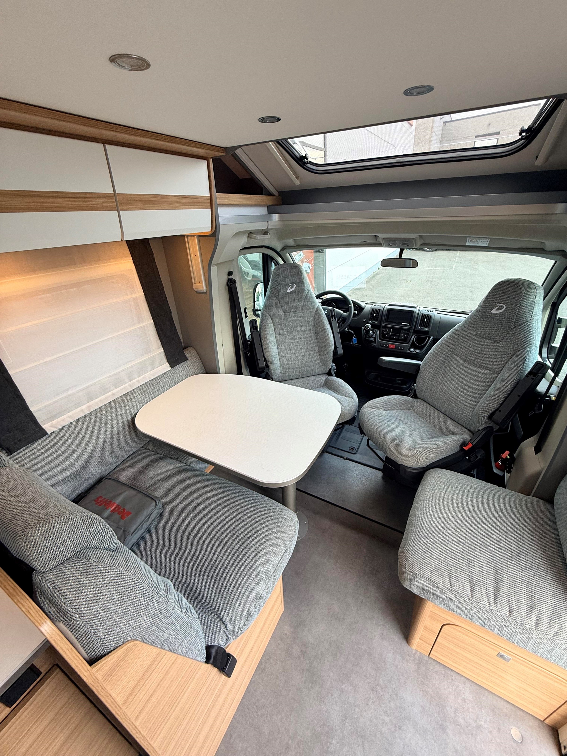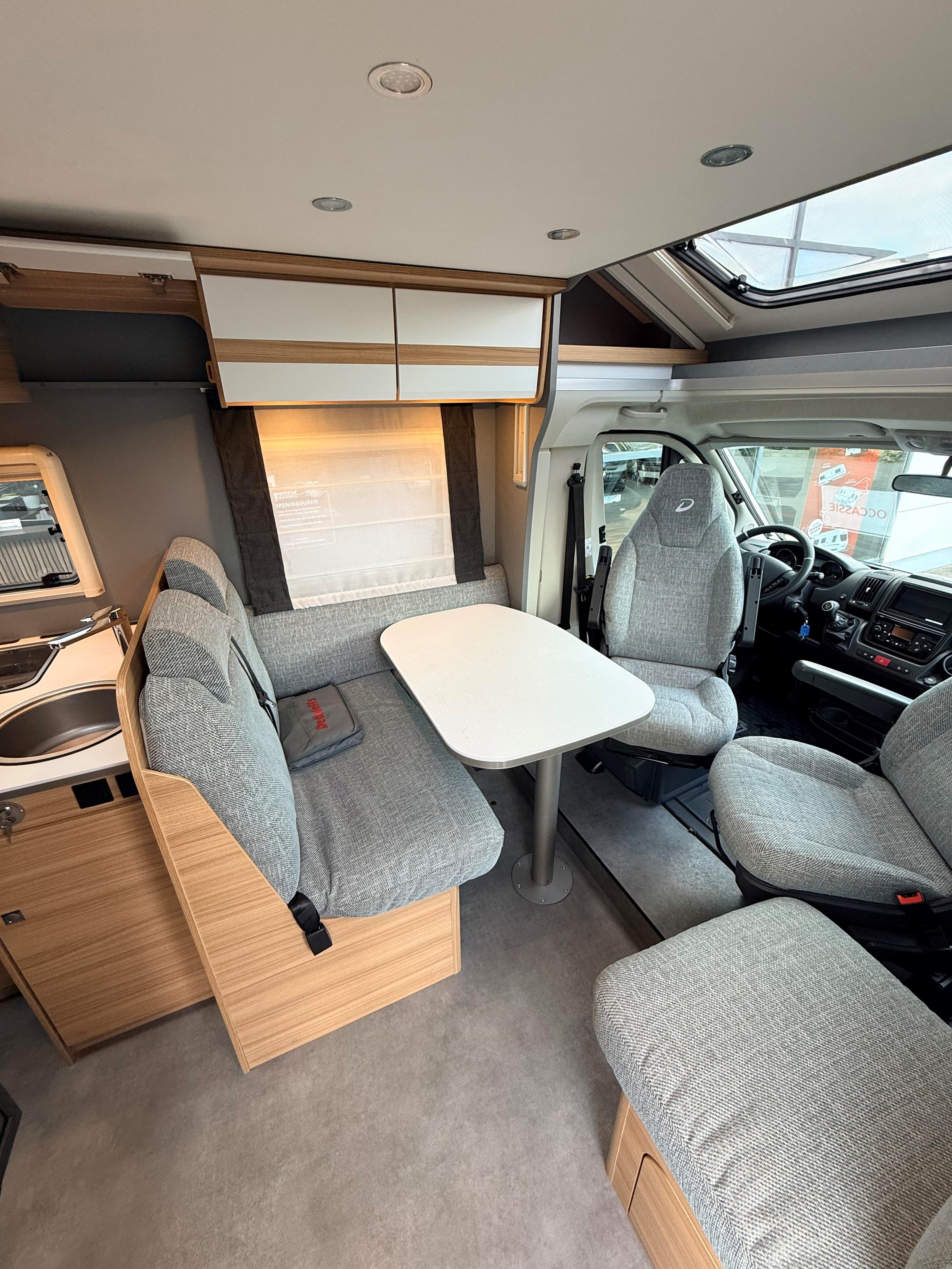 Radioantenne DAB+ (in rechter buitenspiegel geïntegreerd), Radiovoorbereiding incl. luidsprekers in de cabine, Plissé verduistering in de cabine, Hoogte- en kantelverstelling voor beide cabinestoelen, voorzien van armleuningen, Hordeur, Brede, 70 cm toegangsdeur, voorzien van een raam incl. verduistering en centrale vergrendeling (incl. cabinedeuren), Panorama dakluik 70 x 50 cm in het woongedeelte, Uitzetbaar dakraam in de cabine, Gezellige L-zitgroep met een vrijstaande tafel en 2 geïntegreerde 3 punts veiligheidsriemen, Douchevlonder, Buitenlamp 12 v