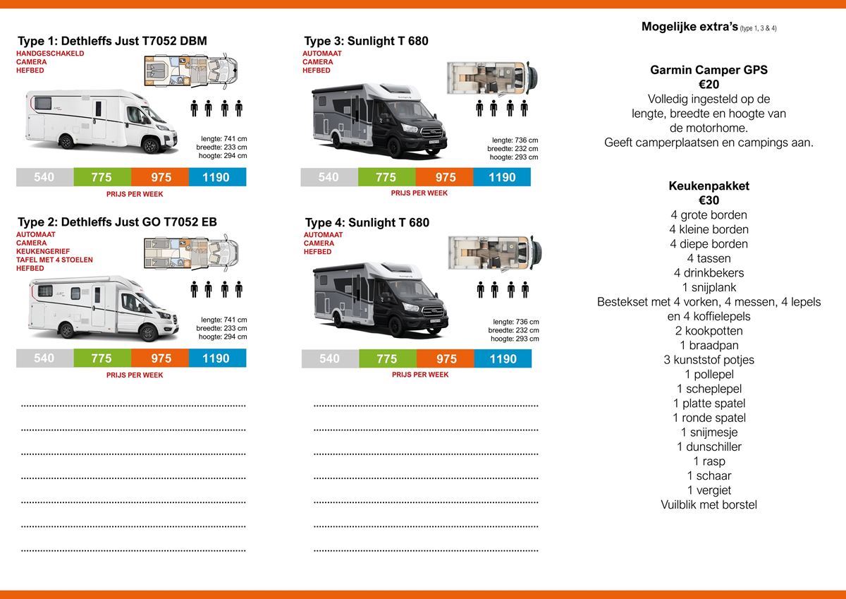 - Het verhuur gamma bestaat uit recente Dethleffs- en Sunlight modellen.